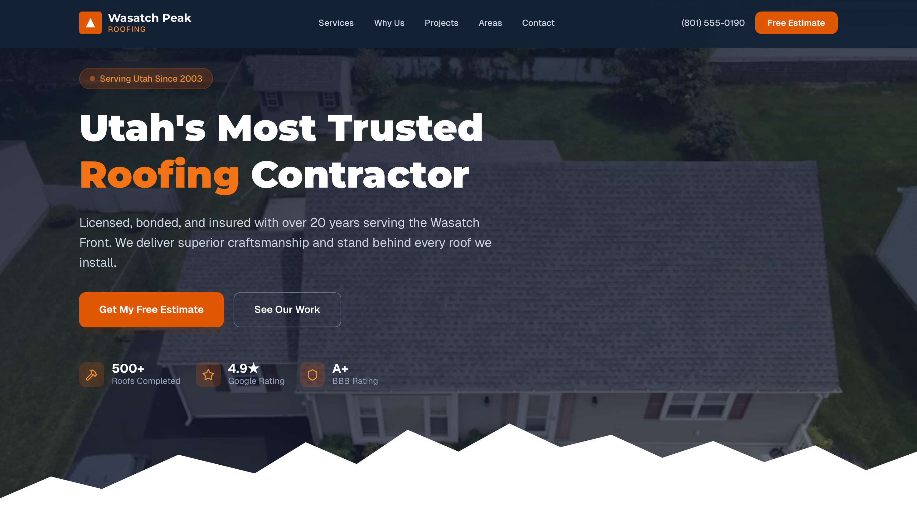 Most local roofers have one of two sites: a 2014 WordPress template their nephew built, or a Yelp-style listing they don’t control. Wasatch Peak gets a different kind of site — one that loads in under a second on a contractor’s truck-cab phone, captures lead intent before a visitor leaves, and shows up when someone searches “roof repair Sandy Utah” on a Tuesday morning at 7am.